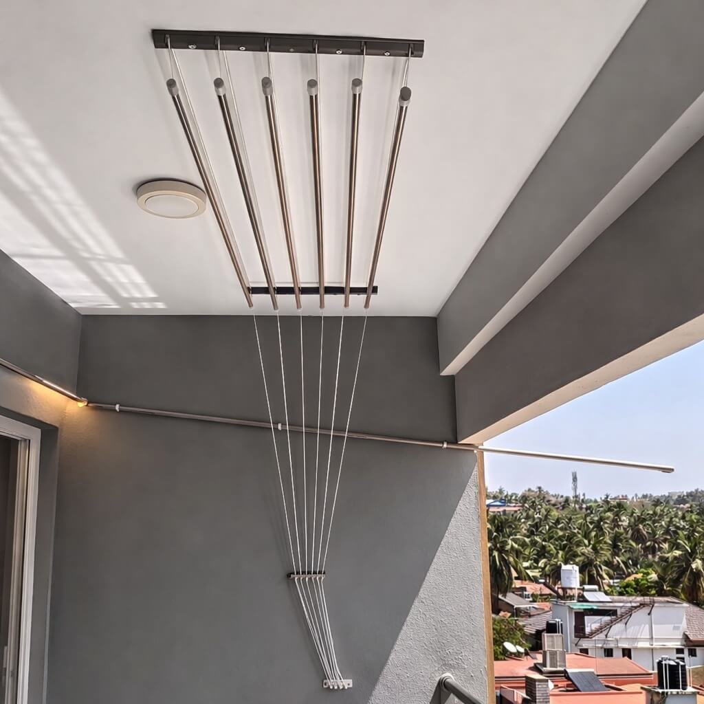 A Cloth Drying Hanger is a modern and space-saving system used to dry clothes in a clean and organised way. Instead of using old floor stands, ropes, or plastic racks, this system is fixed on the ceiling or wall of your balcony.