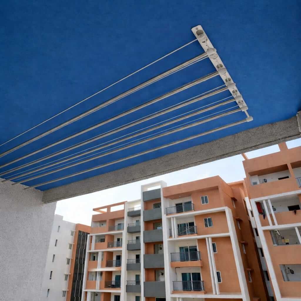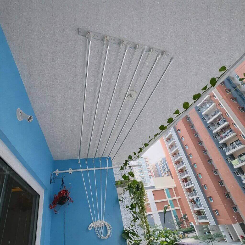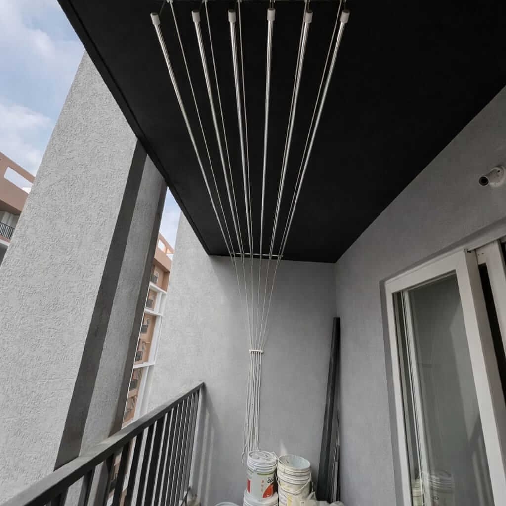 This system helps you dry clothes faster because the rods stay at a higher level where air flow is better. It keeps your balcony clean, organised, and free from water drops on the floor.